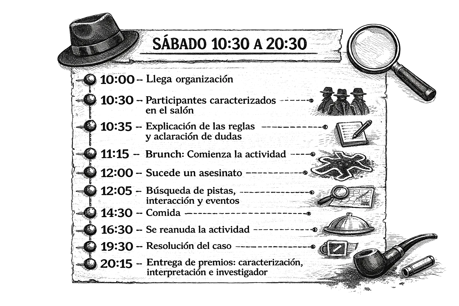El asesino o la asesina está entre vosotros, forma parte del grupo y participa como uno más. A partir de ese momento, deberéis observar, interpretar y atar cabos para reconstruir lo ocurrido y descubrir la verdad antes de que termine el día, viviendo el placer desde dentro de un caso.