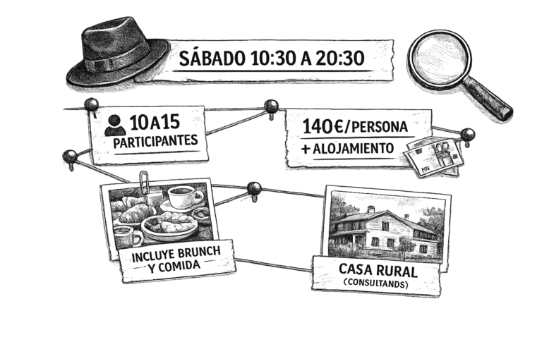 Participa en una experiencia de investigación al estilo de las novelas de Agatha Christie, pensada para disfrutar, sorprenderte y dejarte llevar por una historia en la que nada es exactamente lo que parece. Durante un día completo te sumerges en un relato ambientado en los años 20 o 50, junto a un grupo reducido de entre 10 y 15 personas.