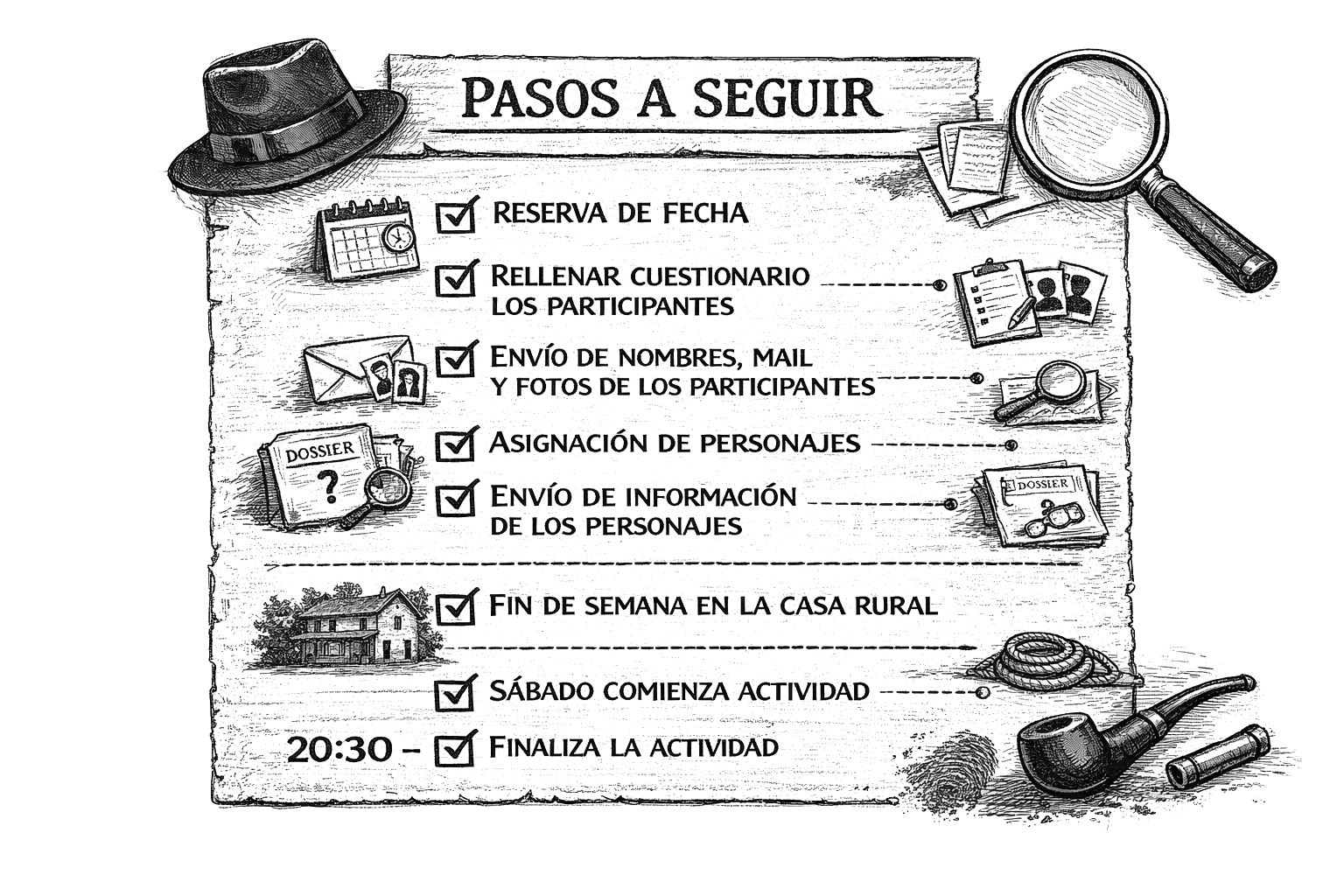 Antes de empezar la actividad cada participante (o una persona de confianza, si se trata de una sorpresa para uno de ellos) completa un breve cuestionario. Esta información nos permite, por un lado, organizar el brunch y la comida del día y, por otro, asignar los personajes de forma personalizada para que todo el mundo se sienta cómodo y disfrute plenamente de la experiencia.